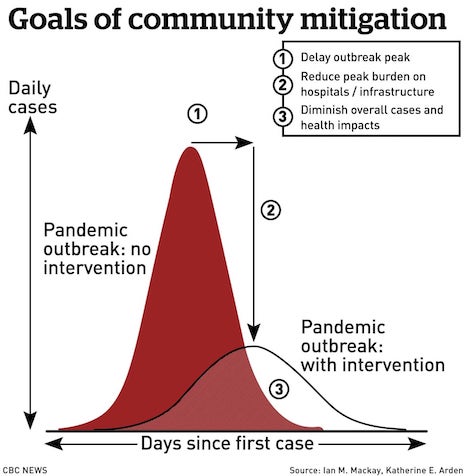 | Ideally, interventions change the shape of an epicurve so case counts come down faster. (CBC News) |