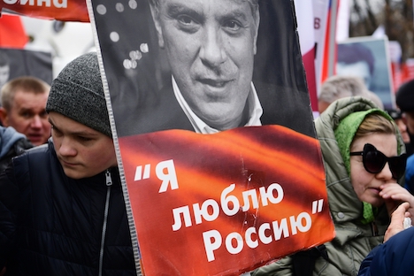 | A banner with a portrait of Nemtsov and a quote: ‘I love Russia’. ©Sputnik / Aleksey Mayshev |