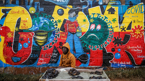 | A boy sells fish at his street stall in front of an informational mural warning people about the dangers of the new coronavirus and how to prevent transmission, with words in Swahili reading “We are the Cure” painted by youth artists from the Uweza Foundation, in Nairobi, Kenya, July 8, 2020. Brian Inganga | AP |