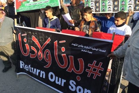 | Palestinian children hold placards during a demonstration to demand the return of the bodies of relatives who were killed by Israeli forces. (Photo: File) |