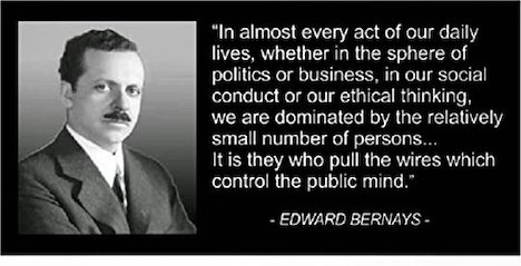 In his main work titled ‘Propaganda’, which he wrote in 1928, Bernays argued that the manipulation of public opinion was a necessary part of democracy in which individuals were inherently dangerous (to the rapacity of the elites) but could be harnessed and channeled by these same elites for their economic benefit. He wrote further that “No serious sociologist any longer believes that the voice of the people expresses any … wise idea. The voice of the people expresses the mind of the people, and that mind is made up for it by … those persons who understand the manipulation of public opinion. It is composed of inherited prejudices and symbols and clichés and verbal formulas supplied to them by the leaders. Fortunately, the … politician is able, by the instrument of propaganda, to mold and form the will of the people.” He clearly believed that virtually total control of a population was possible, and perhaps easy to accomplish: “So vast are the numbers of minds which can be regimented, and so tenacious are they when regimented, that (they produce) an irresistible pressure before which legislators, editors, and teachers are helpless.”