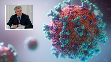 | Visualisation of the Covid-19 virus. © Unsplash / Fusion Medical Animation; (inset) Chairman of the State Duma of the Russian Federation Vyacheslav Volodin in Moscow, 22.04.21. © RIA |