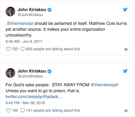 “I am appalled that yet another whistleblower in touch with The Intercept has been outed and arrested. … [P]erhaps The Intercept should walk away from national security reporting before its lack of journalistic professionalism ruins any more lives.”